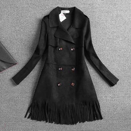 歐洲站秋冬新款雙排扣翻領(lǐng)下擺流蘇鹿皮絨風衣外套女麂皮絨風衣 /
