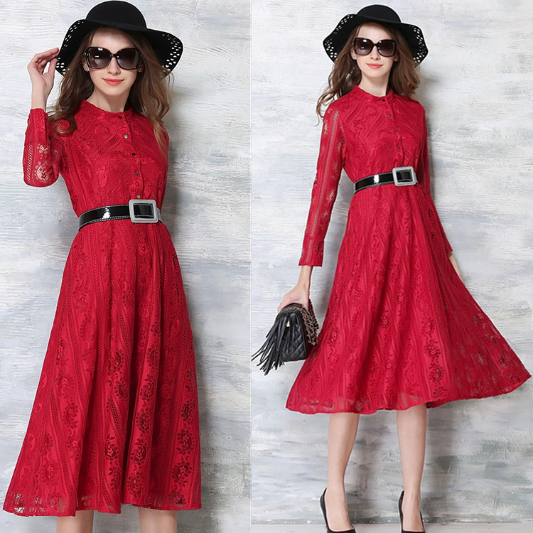 歐洲站2016春季新品優(yōu)雅女神范蕾絲長款修身連衣裙一件代發(fā) /
