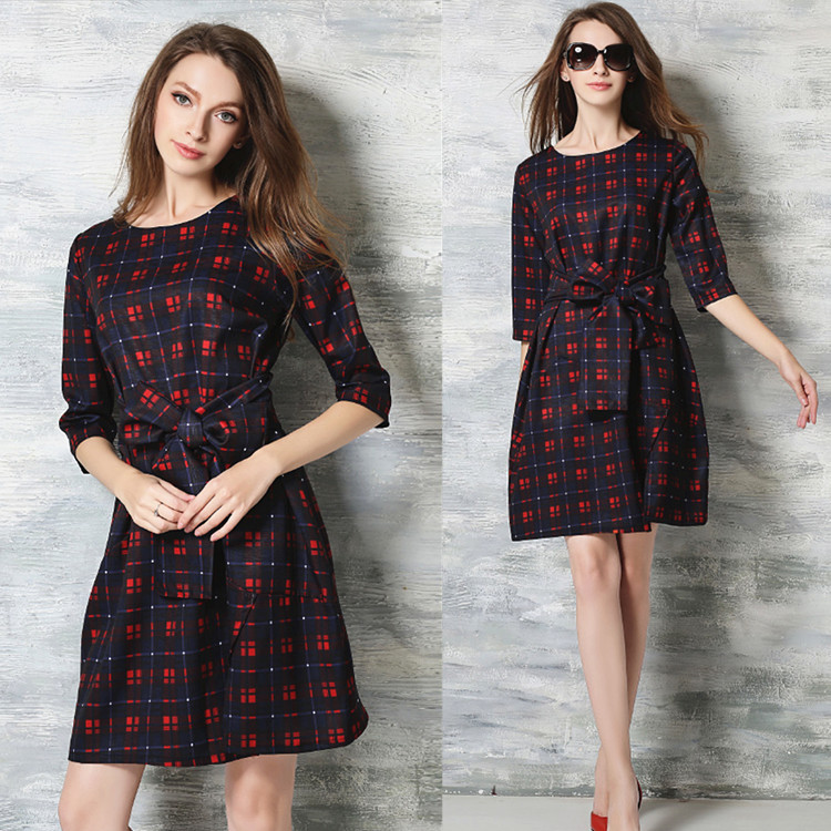 歐洲站春裝新品女大碼寬松顯瘦歐美氣質(zhì)七分袖時尚百搭格子連衣裙 /
