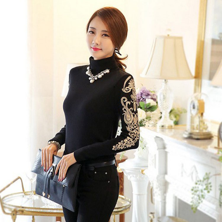 2015秋冬新款女裝韓版長袖高領(lǐng)加絨加厚蕾絲衫打底衫保暖衣T恤衫 /