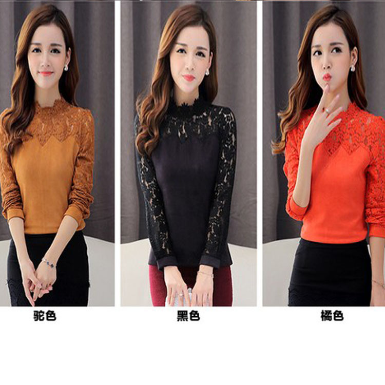 蕾絲打底衫女長袖2015秋冬新款小衫麂皮絨鏤空蕾絲衫女 /