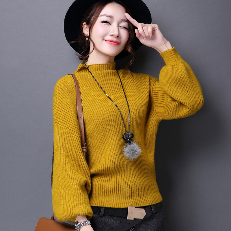 秋冬新款2015韓版寬松短款半高領(lǐng)燈籠袖女式針織衫時尚百搭毛衣女 /