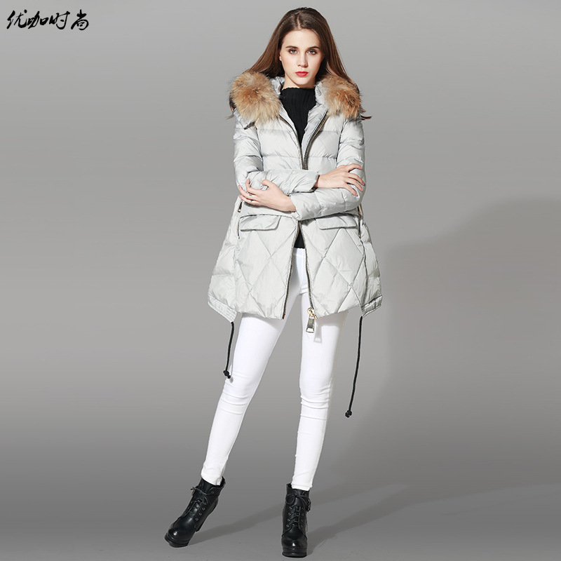 歐洲站2015冬季新款高端女裝 歐美寬松貉子毛領(lǐng)連帽百搭羽絨服女 /