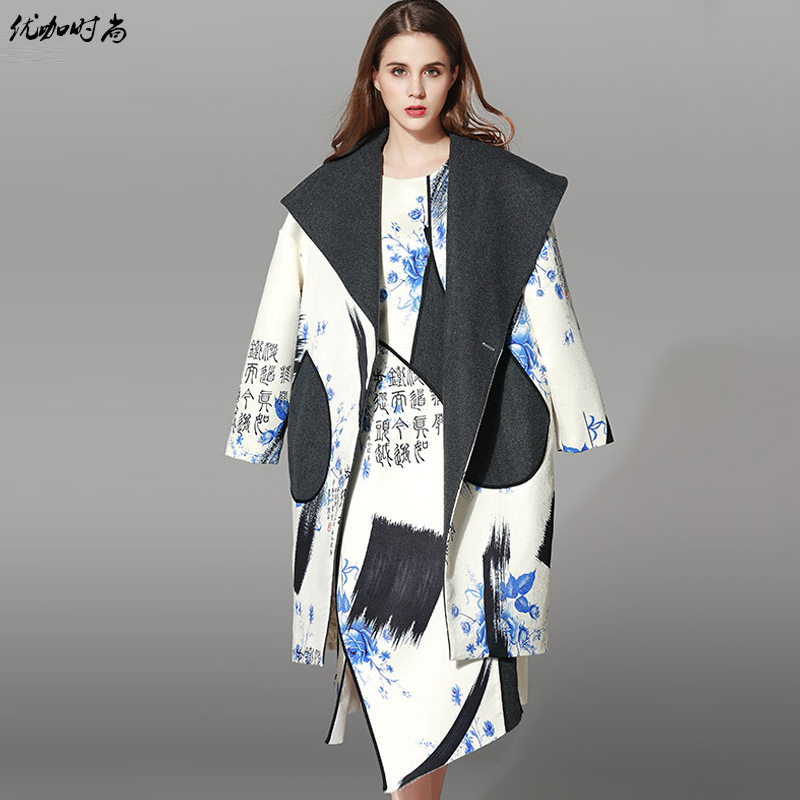 歐洲站2015冬裝新款高端精品女裝歐美大牌中國風(fēng)大衣寬松印花風(fēng)衣 /