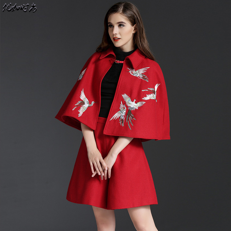 歐洲站2015秋冬新款精品女裝 時(shí)尚繡花羊毛呢外套披肩+半裙套裝 /