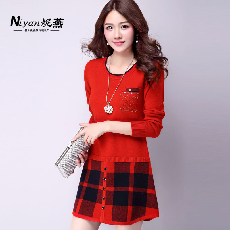 時(shí)尚A字拼接格子裙擺女式針織連衣裙 韓版潮流秋冬新款中長(zhǎng)款毛衣 /