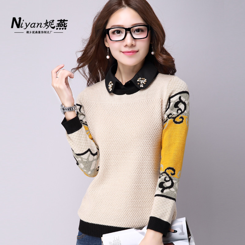 拼接翻領(lǐng)時(shí)尚釘珠長(zhǎng)袖女式針織打底衫 韓版印花潮流秋冬新款毛衣 /