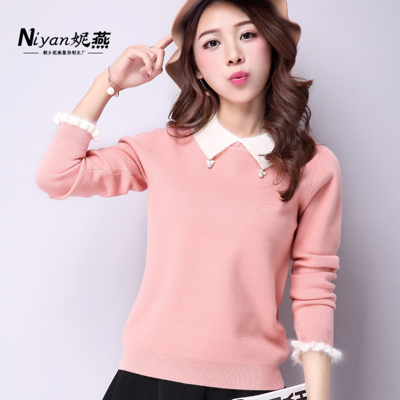 甜美時(shí)尚娃娃領(lǐng)長(zhǎng)袖新款女裝 秋冬女式拼接撞色修身針織套頭毛衣 /
