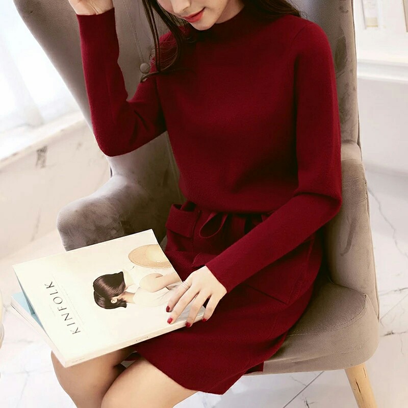 冬季新款韓版時(shí)尚寬松長(zhǎng)款修身純色有腰帶包芯紗針織連衣裙女爆款 /