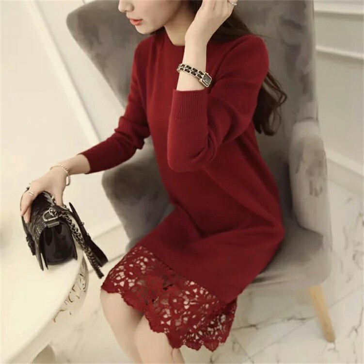 冬季新款韓版時(shí)尚寬松長(zhǎng)款下擺蕾絲邊針織衫女連衣裙一件代發(fā)女裝 /
