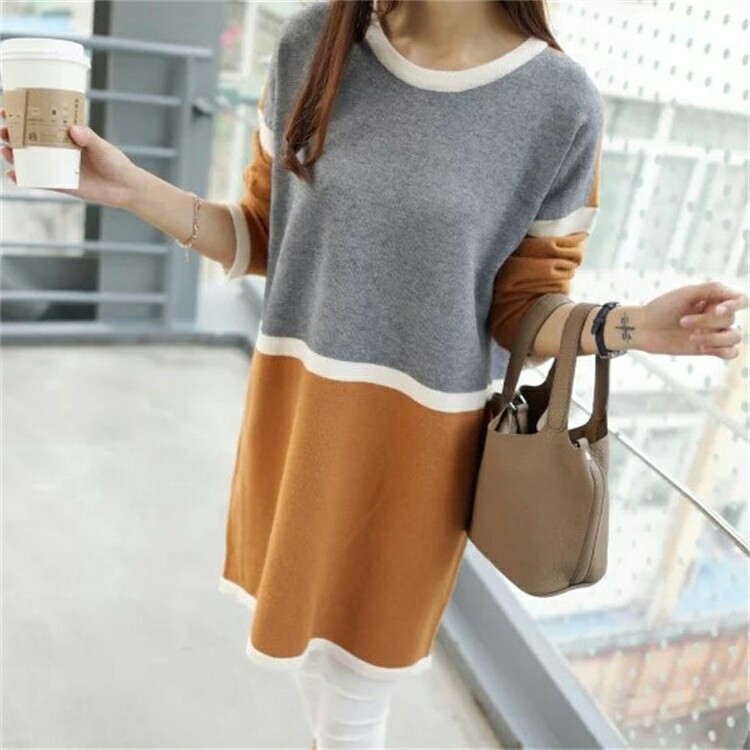 冬季新款韓版時(shí)尚爆款拼色撞色拼接圓領(lǐng)套頭中長(zhǎng)款針織衫女連衣裙 /