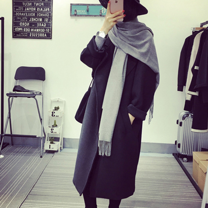 5613 秋冬歐美寬松百搭純色長(zhǎng)款大翻領(lǐng)毛呢外套大衣女 /