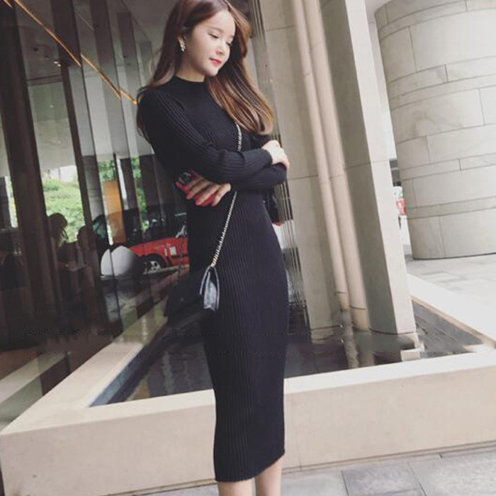 6835 韓版新款優(yōu)雅氣質(zhì)長(zhǎng)袖小高領(lǐng)中長(zhǎng)連衣裙打底裙子 /