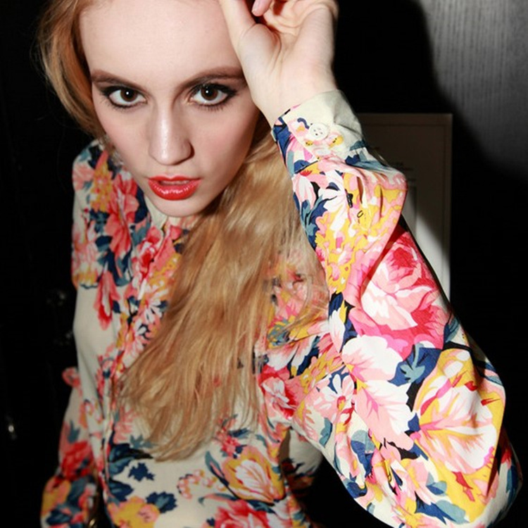 2015歐美個性性感 春季新款印花彩色長袖墊肩 碎花雪紡襯衫 /