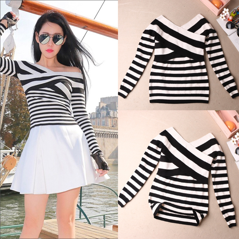 2015新款毛衣女 左岸瀟明星同款 黑白條紋一字領針織套頭毛衣批發(fā) /