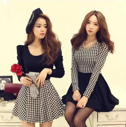 廠家直銷2015秋季韓版千鳥格長袖修身氣質(zhì)連衣裙 打底裙 /