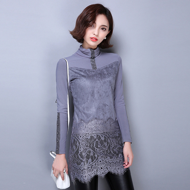 2016春裝新款女上衣堆堆領(lǐng)長袖加絨打底衫中長款蕾絲衫冬 /