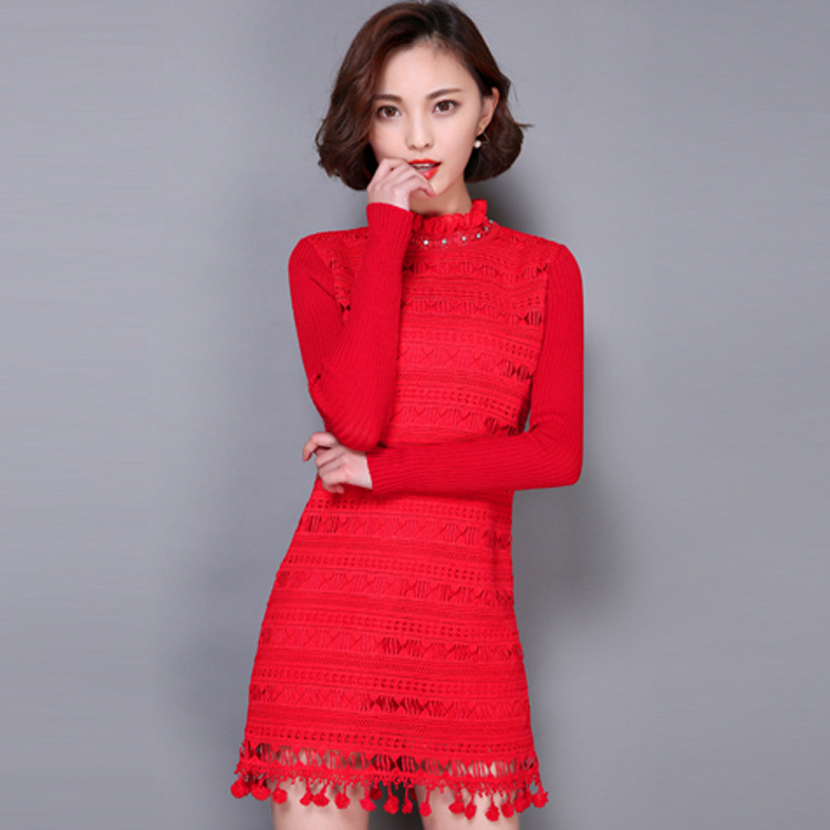 秋冬新款加絨加厚釘珠蕾絲拼接打底衫中長款 圓領(lǐng)套頭修身連衣裙 /