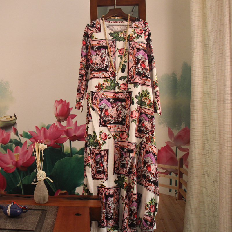 2015長(zhǎng)袖新款棉麻連衣裙大碼寬松文藝花色亞麻袍子 /