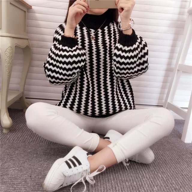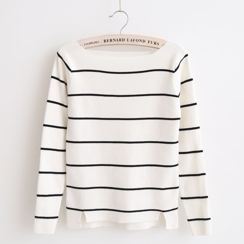 秋冬新款打底衫針織衫一字領(lǐng)毛衣女緊身條紋中長款女士秋冬低領(lǐng)潮 /