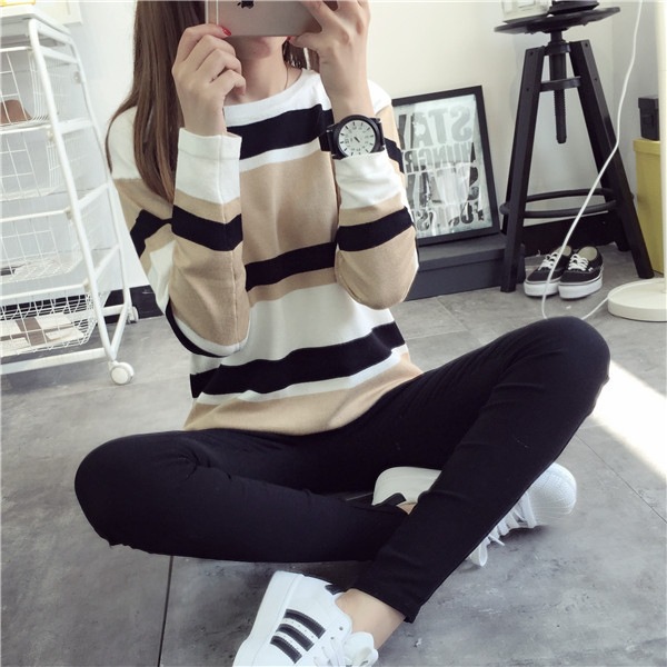 秋冬女裝新款外套毛衣女拼色條紋套頭2015寬松學(xué)生冬裝秋款潮 /