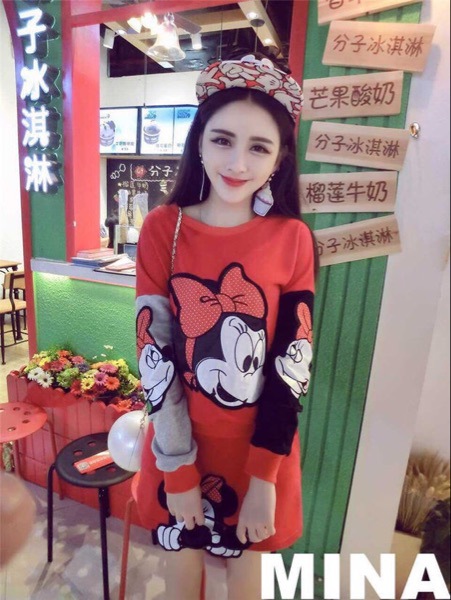 2015秋冬新款韓版連衣裙女式米奇印花長袖T恤裙撞色立體剪 /