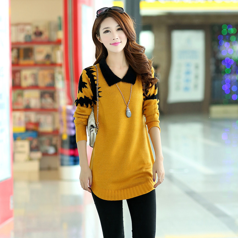 2015秋冬新款女裝 韓版翻領(lǐng)女式毛衣中長款打底針織毛衣裙 批發(fā) /