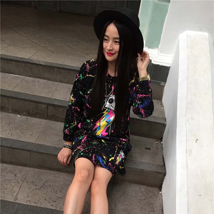 十三行批發(fā)秋冬季韓版新品中長款長袖女裝純棉潑墨女式T恤 /