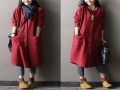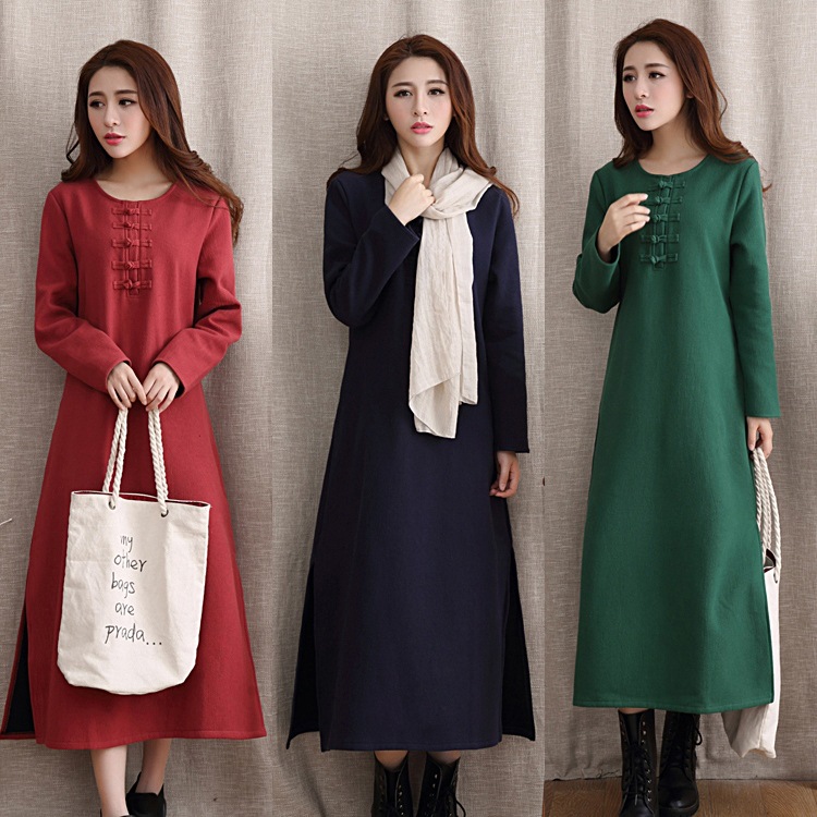 森女系2015冬季新款 復(fù)古盤扣純色加絨棉麻氣質(zhì)長袖連衣裙 /