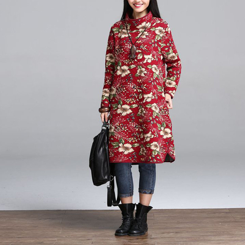 實拍2015秋冬新款文藝堆堆領(lǐng)夾棉加厚印花打底連衣裙長裙 /