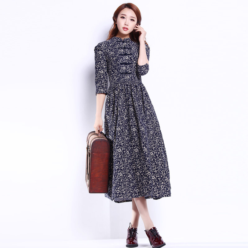 2015春秋新款連衣裙復(fù)古碎花亞麻連衣裙棉麻中袖大擺印花長裙 /