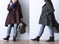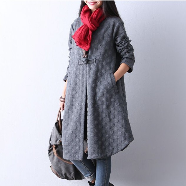 2015秋冬新款文藝中長款格子盤扣棉麻連衣裙式一??弁馓罪L衣 /