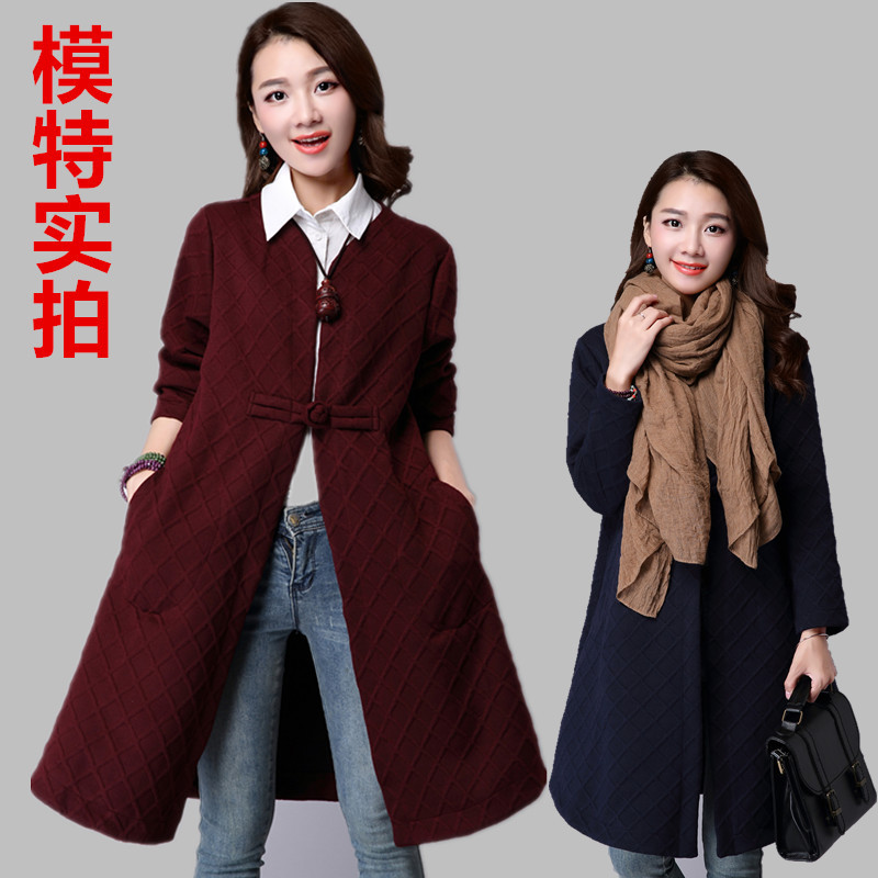 新款民族風印花復古中長款外套 加絨加厚棉麻風衣時尚個性女裝 /