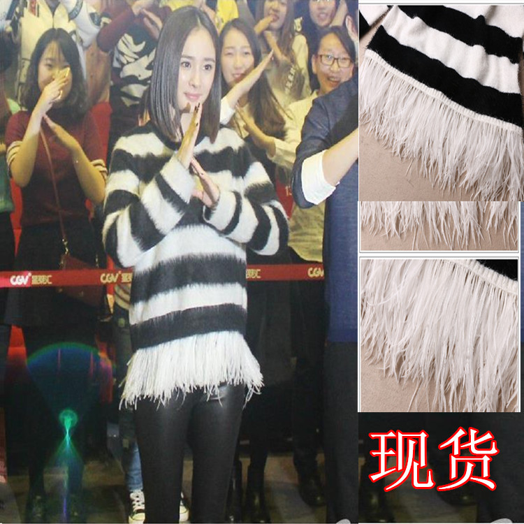 現(xiàn)貨 我是證人發(fā)布會(huì)明星楊冪同款黑白條紋水貂絨羽毛流蘇毛衣女 /