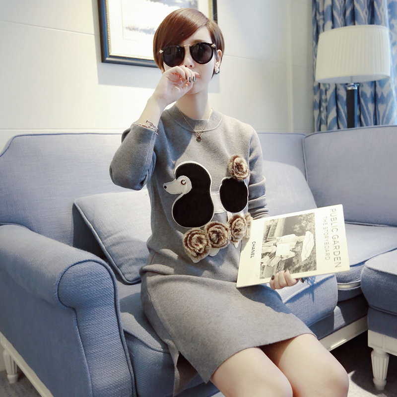 歐洲站女裝秋冬裝新款圓領動物圖案中長款套頭針織連衣裙16 /