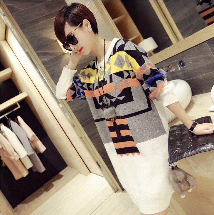 歐洲站秋季新款女裝復古幾何毛衣中長款韓版長袖針織連衣裙 /