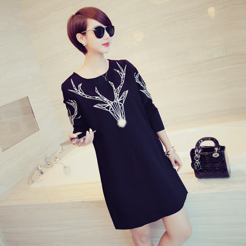 歐洲站女裝秋冬裝新款圓領珍珠麋鹿圖案中長款套頭連衣裙 /