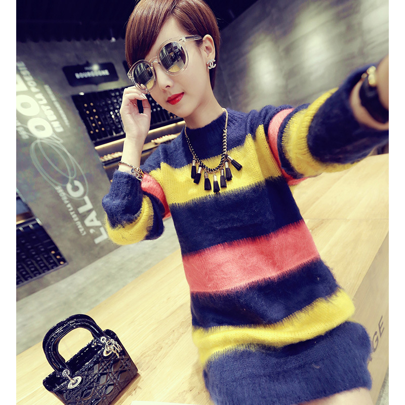 歐洲站冬裝新款女裝圓領條紋修身中長款套頭針織連衣裙 /