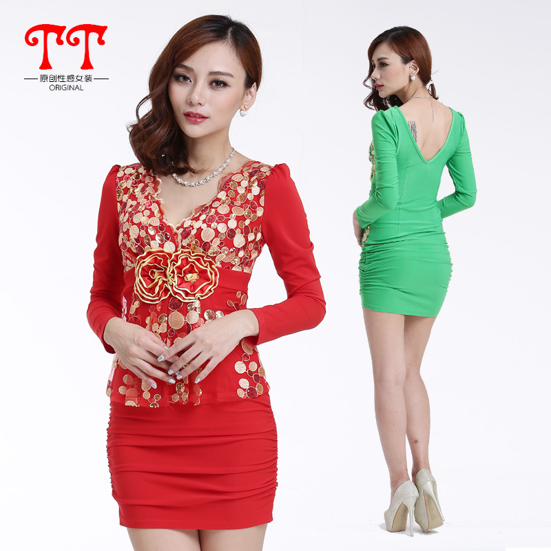 2015秋冬新款ktv夜店時尚女裝修身性感包臀連衣裙V領(lǐng)低胸漏背長袖 /