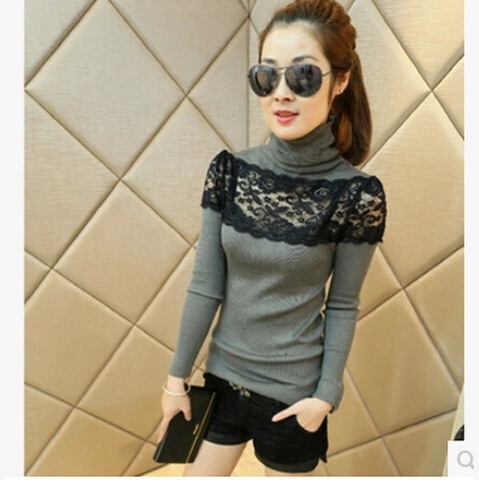 2015春秋冬清倉(cāng)尾貨高領(lǐng)鏤空蕾絲拼接長(zhǎng)袖針織衫打底衫女 /