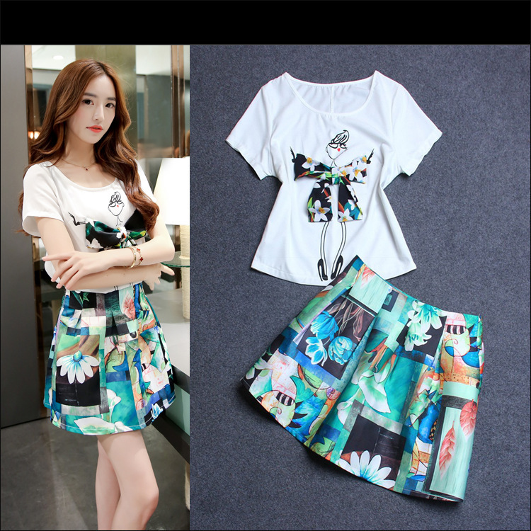一件代發(fā) 立體歐美娃娃圓領(lǐng)短袖T恤上衣 時尚印花半裙兩件套裝 /