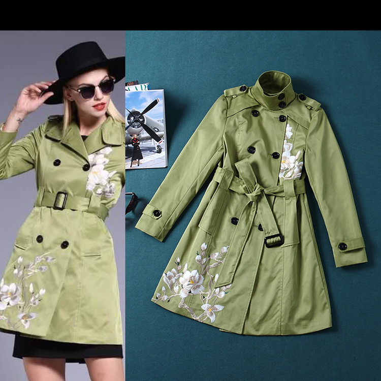 刺繡 中長款大衣外套2015秋冬高端新款歐風(fēng)衣女款綠色黃色雙排扣 /