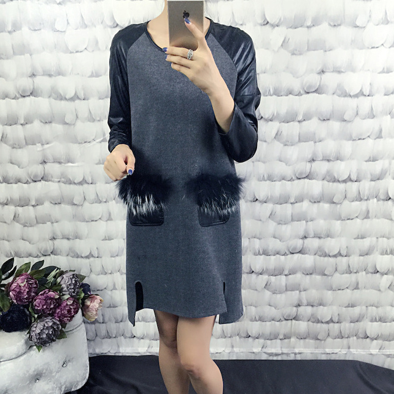 歐洲站2015秋季新款純色雙兜皮袖拼毛連衣裙拼接顯瘦直筒裙 /