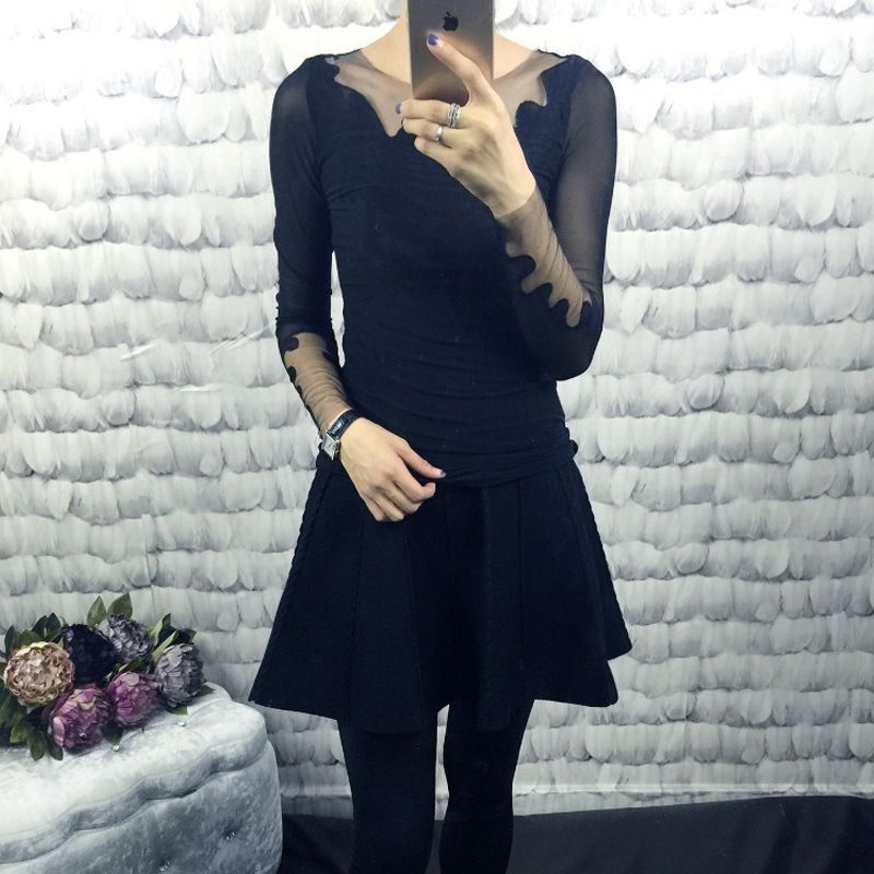 歐洲站2015秋冬大牌性感重工網(wǎng)紗繡花蕾絲修身長(zhǎng)袖打底衫潮 批發(fā) /