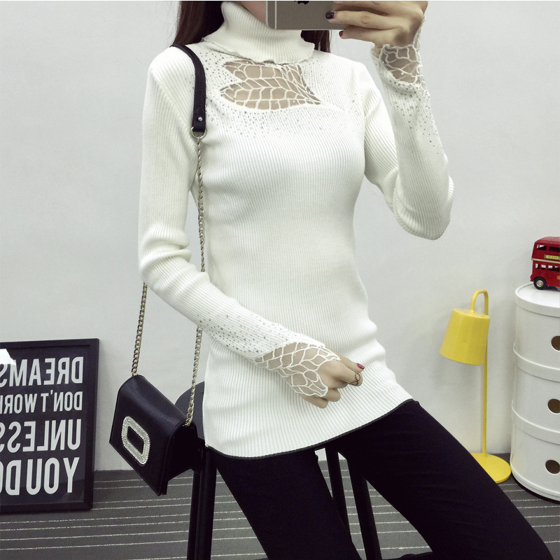 秋冬新款2015女裝針織衫修身高領(lǐng)燙鉆歐洲站鏤空打底衫套頭毛衣女 /