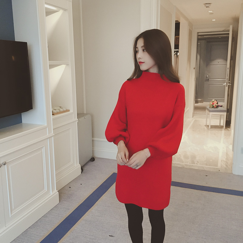 2015秋冬季新品韓國毛衣半高領(lǐng)寬松韓版燈籠袖針織衫女套頭中長款 /