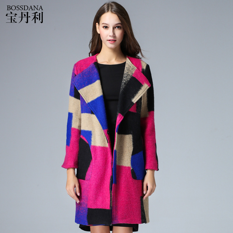 歐美2015秋冬新款毛呢外套女裝多彩拼接中長(zhǎng)款加厚大碼呢子大衣 /
