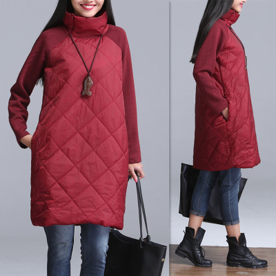 2015秋冬新款韓版寬松大碼女裝高領(lǐng)厚夾棉拼接長袖連衣裙打底外套 /