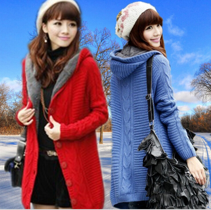 2015秋冬新款女式針織衫 韓版麻花保暖中長款加絨加厚毛衣外套女 /