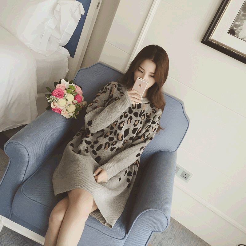 歐美2015秋冬韓國新款圓領(lǐng)豹紋顯瘦中長款打底針織毛衣連衣裙女 /